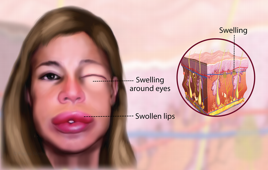 对乙酰氨基酚和NSAIDs不仅是引发药物过敏反应的常见药物,还可以绕过免疫系统诱发类似变态反应的症状,在易感个体中可诱发荨麻疹、血管性水肿(如下图,眼睛肿、嘴巴肿)。