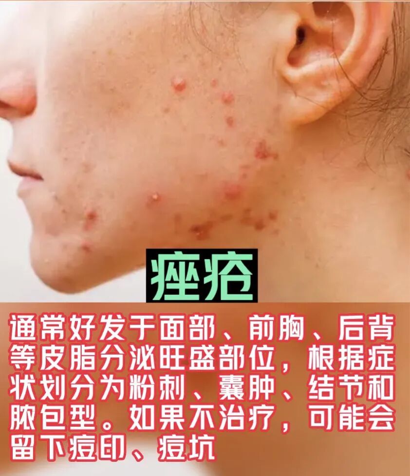 3. 痤疮:痤疮的症状包括面部、胸部和背部等皮肤部位出现粉刺、丘疹、脓疱和囊肿。