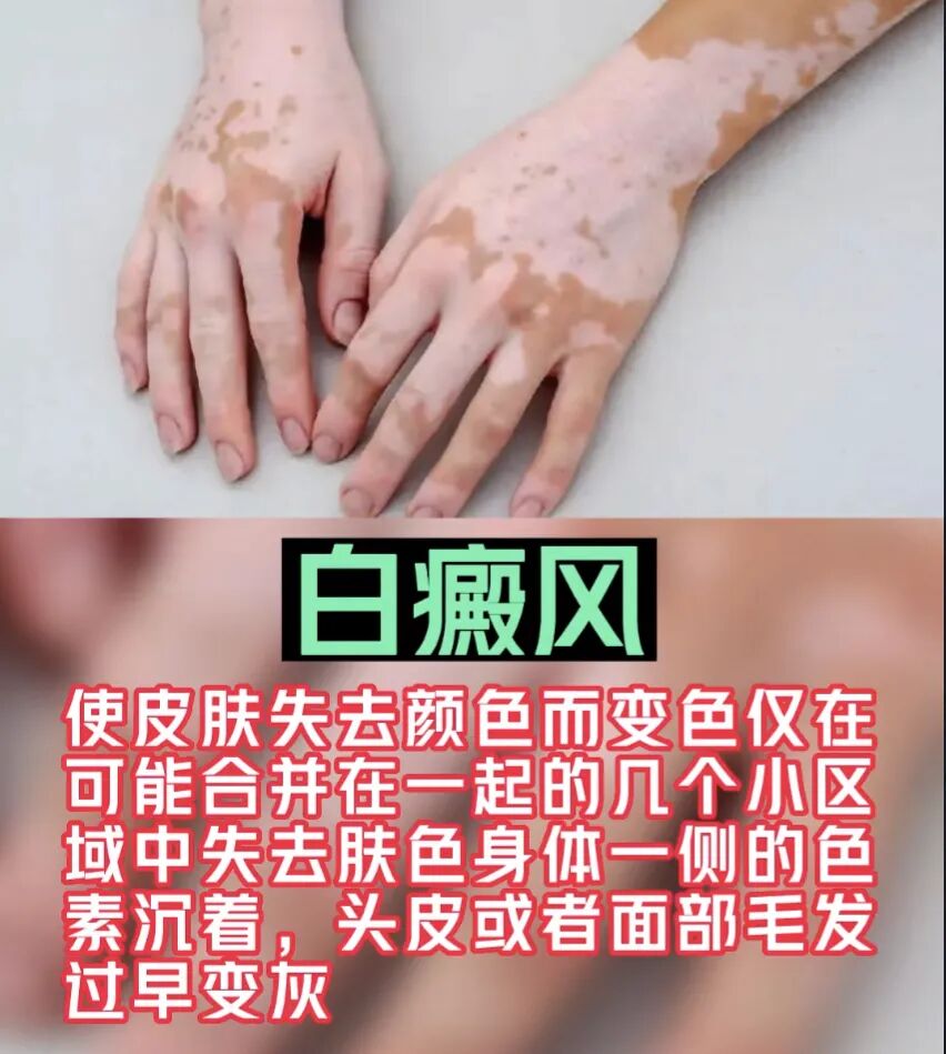 7. 色素改变:一些皮肤病会导致皮肤色素沉着或脱失,如白癜风、黑色素瘤等。