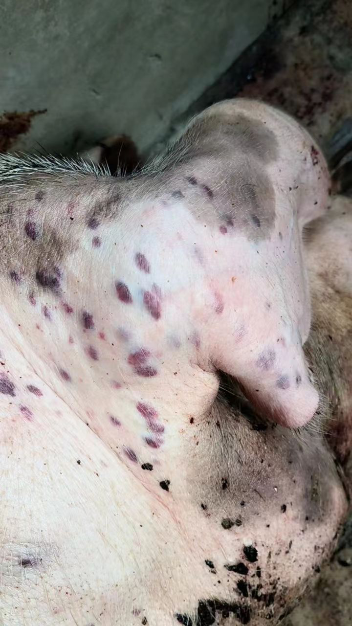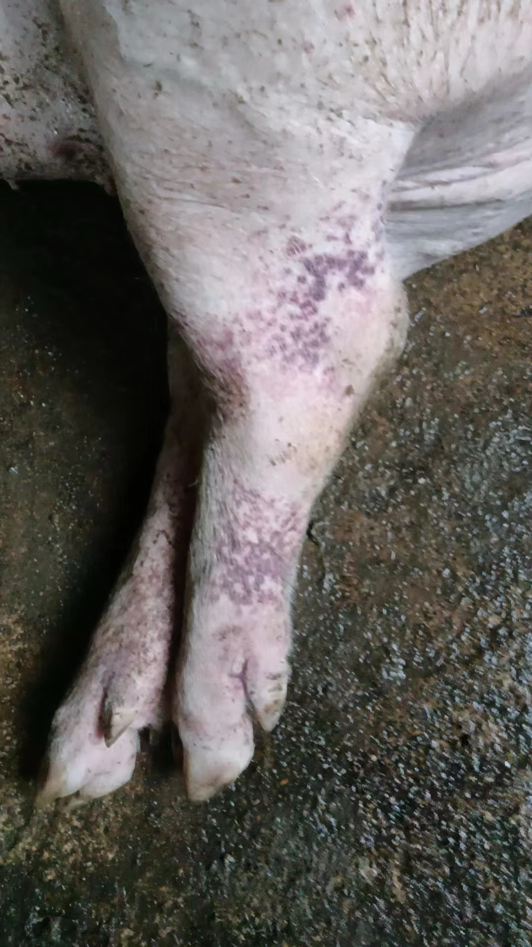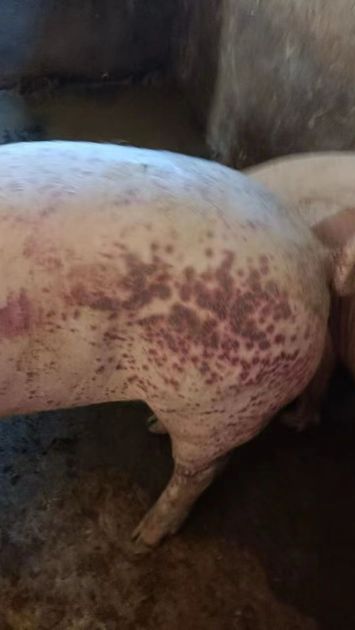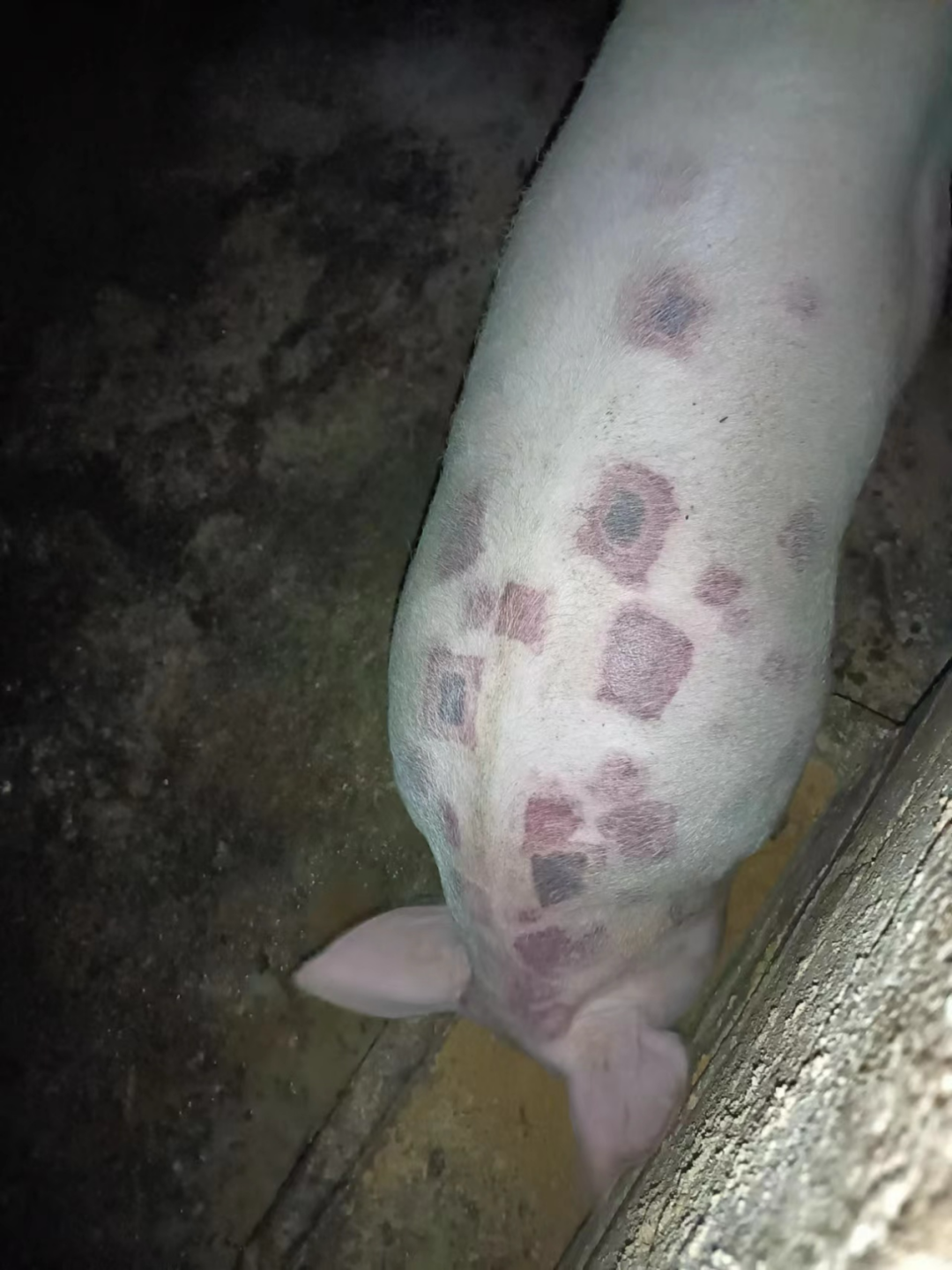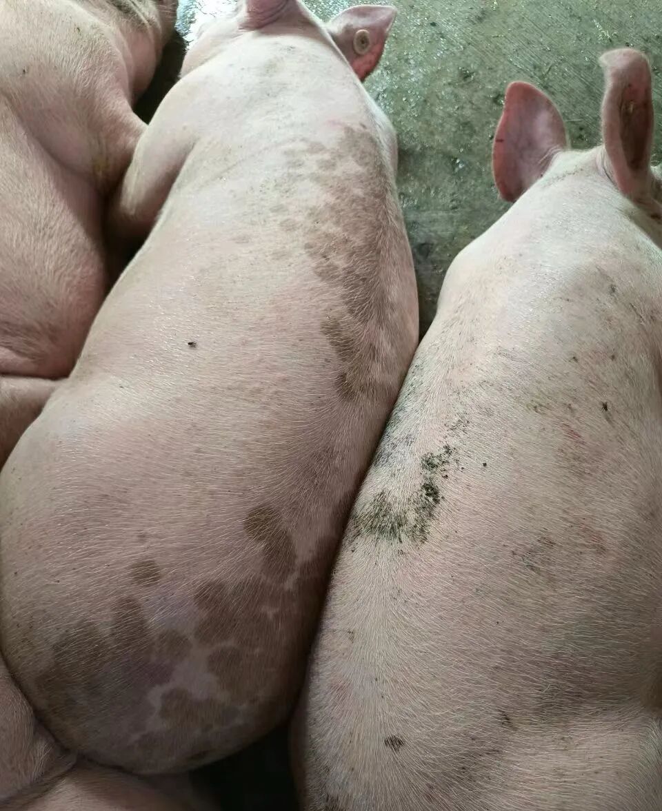 1.圆环病毒(皮炎肾病综合症):患病猪的体温基本正常,吃料正常,但腿部及臀部会出现黄豆状红斑,随着病程延长,会出现采食欲望降低,体温升高,红斑成片,不及时治疗就会死亡。
