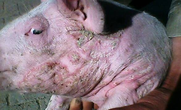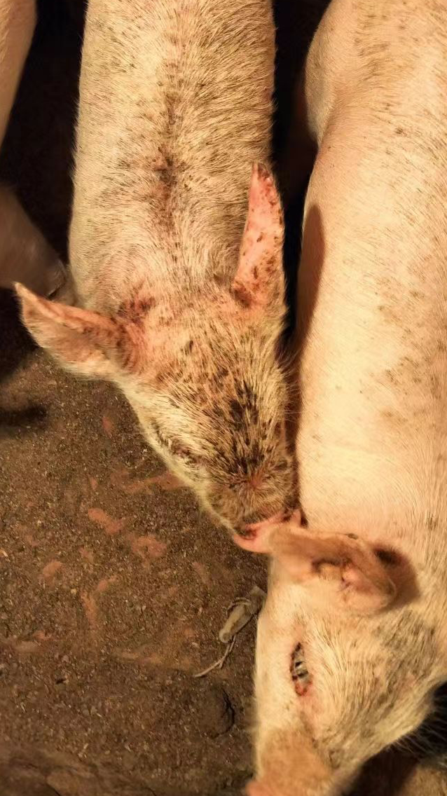 1.皮肤疥螨:发病猪会出现皮肤瘙痒,蹭墙,皮肤溃烂,眼眶周围,耳朵感染,结痂、深裂纹、脱毛、脓疱,脊柱两侧有鳞屑等症状。