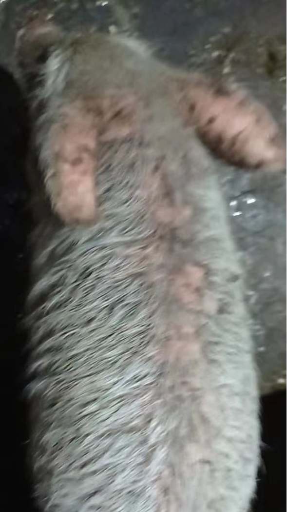 1.小孢子菌:病发部位会出现豆子状黑红色片状不连溃烂,一般对称性病发,随着病程长,这些溃烂点会汇集一起,形成一大块圆心型发黑区域,这个时候猪吃料依旧正常或出现少量减料,但死亡后解剖时,就会发现器官有结节现象。