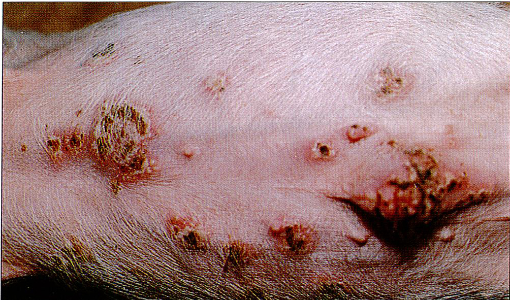 3.链球菌脓皮病:发病症状为皮肤脓肿、溃烂、坏死、结痂,化脓,周围皮肤发红。