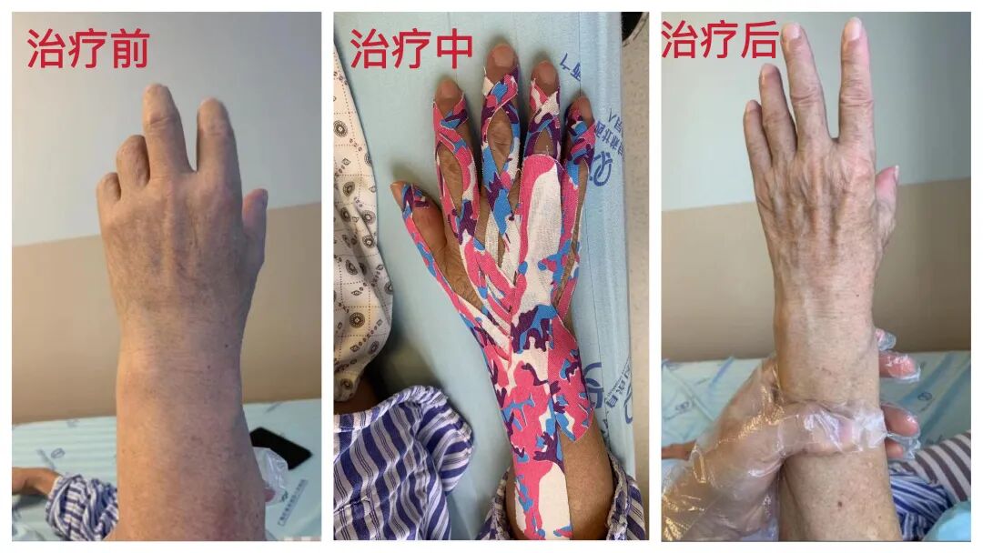 根据张叔的病情,科室治疗师经过讨论,决定给他使用肌内效贴进行消肿治疗。经过3至5天的治疗,仅使用两次肌内效贴,张叔(化名)肿胀明显消退,功能障碍明显改善 ,目前活动自如。