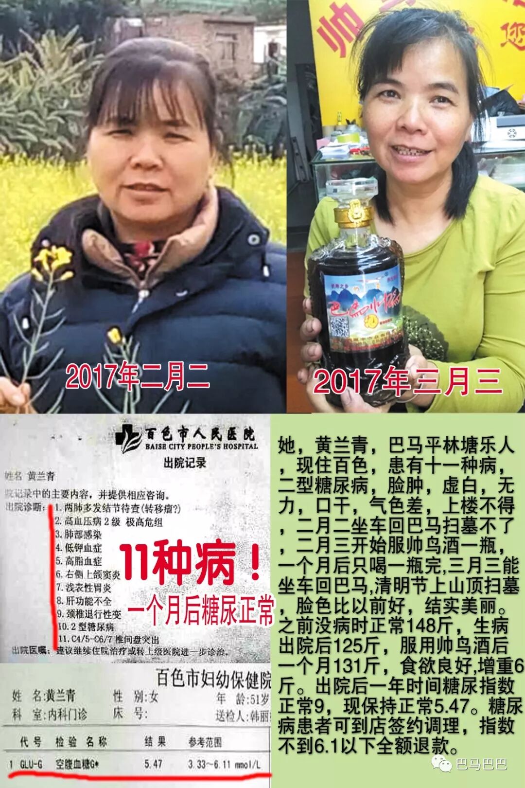 上面这个人就是典型糖尿,左右对比,一看就阳虚肥胖,阳气不足,产生了十一种病,所以补阳成了必须的,补阳调理后,人结实了,那么如何补阳呢?在过来的试验中,我曾在试产帅鸟酒中加入加入滋阴类食物葛根等几种肽分子,给这个糖尿病患者试用后,断断续续一个月,她才喝到九两就变成右边那样子,体重增加但结实,效果出我的预料。后来陆续试验,有阳萎,胃病,三高,痛风等很多阴阳虚患者,才吃十几克肽粉都收到了良好效果,大超出我的想象。也有上热下寒者,上穿衬衫下穿棉袜,七月戴帽者,都有有效果.