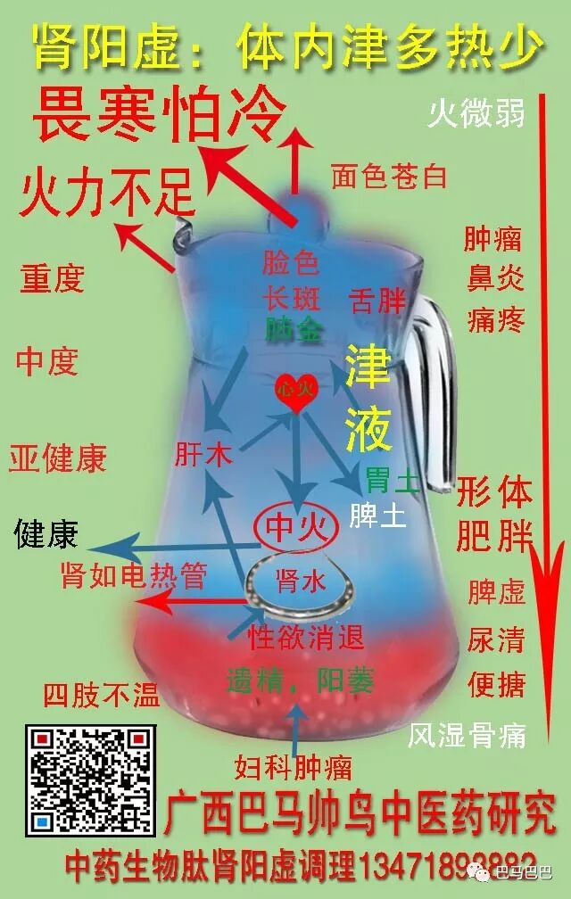 说完热病阴虚我们再说阳虚寒症:所谓阳虚就是阳气不足,我又先来简单的用水壶来形象比喻一下人体引发阳虚的结局。一开始,人体正常平衡,水位合适,水火相宜,体温37正常,当阴气,外来水分一步步加重进入,阴多化为水,水温越来越低,水位(津液)越来越多,浓度越来越稀(气血虚),发热管(肾)发热不足,体温下降,苍白怕冷,肾虚,痛疼,鼻炎发生,长期不理,温度再下降,肿癌发生,由冷变热,发烧过后,阳尽人亡,又是一个无限轮回。人长期过冷,如夜晚没盖棉被,肾火不足抵抗空调寒气,就会感冒发烧。人体肾火不能加温到37度,只有35-36度,那就感觉手脚冷了。