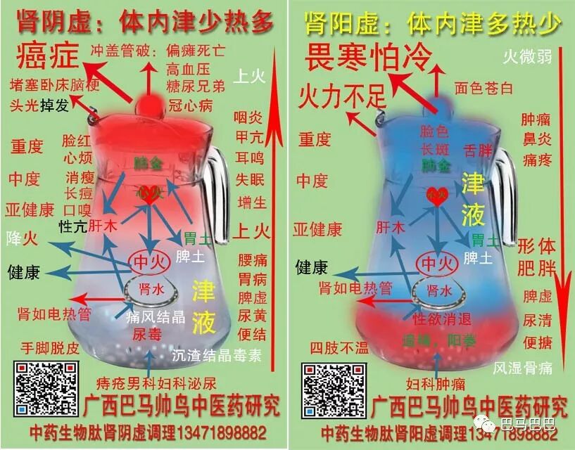 知道了人体生病主要由肾阴虚与肾阳虚两种问题引起,很多人还是不很了解,我先来简单的用水壶来形象比喻一下人体引发肾阴虚的结局。一开始,犹如水煮青蛙,慢慢升温,从失衡开始的无感觉到热到难受,会有几年到十几年的时间,一步步加重,水温越来越高,水位(津液)越来越少,浓度越来越浓(开始有了痘痘,糖尿,三高),发热管(肾)结晶,痛风就会发作严重成节,管残肾废,(光头,脑梗,尿毒,心脏,癌症等大病发生),当高温一度下降,由热变寒,那就到阳尽人亡了。看看下面水壶,温度越高,到顶越危险.