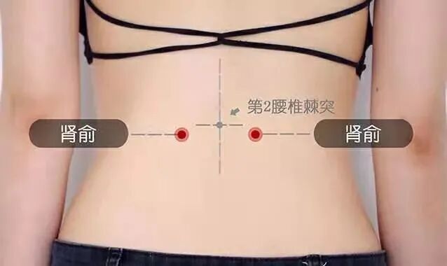 它的位置也非常好找,就在后腰,和肚脐眼正对着,往左右两边走两根手指的宽度,就找到了肾俞穴。