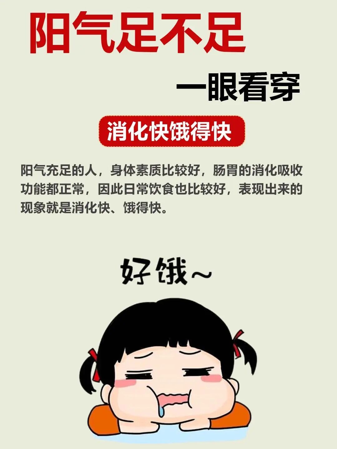阳气充足的人往往消化吸收能力较强,食欲良好,吃得下也消化得快。如果你经常感到饿,胃口好,饭量大,那么可能是阳气充足的标志。阳气不足的人往往食欲不振,消化慢,容易感到胃胀或食欲减退。