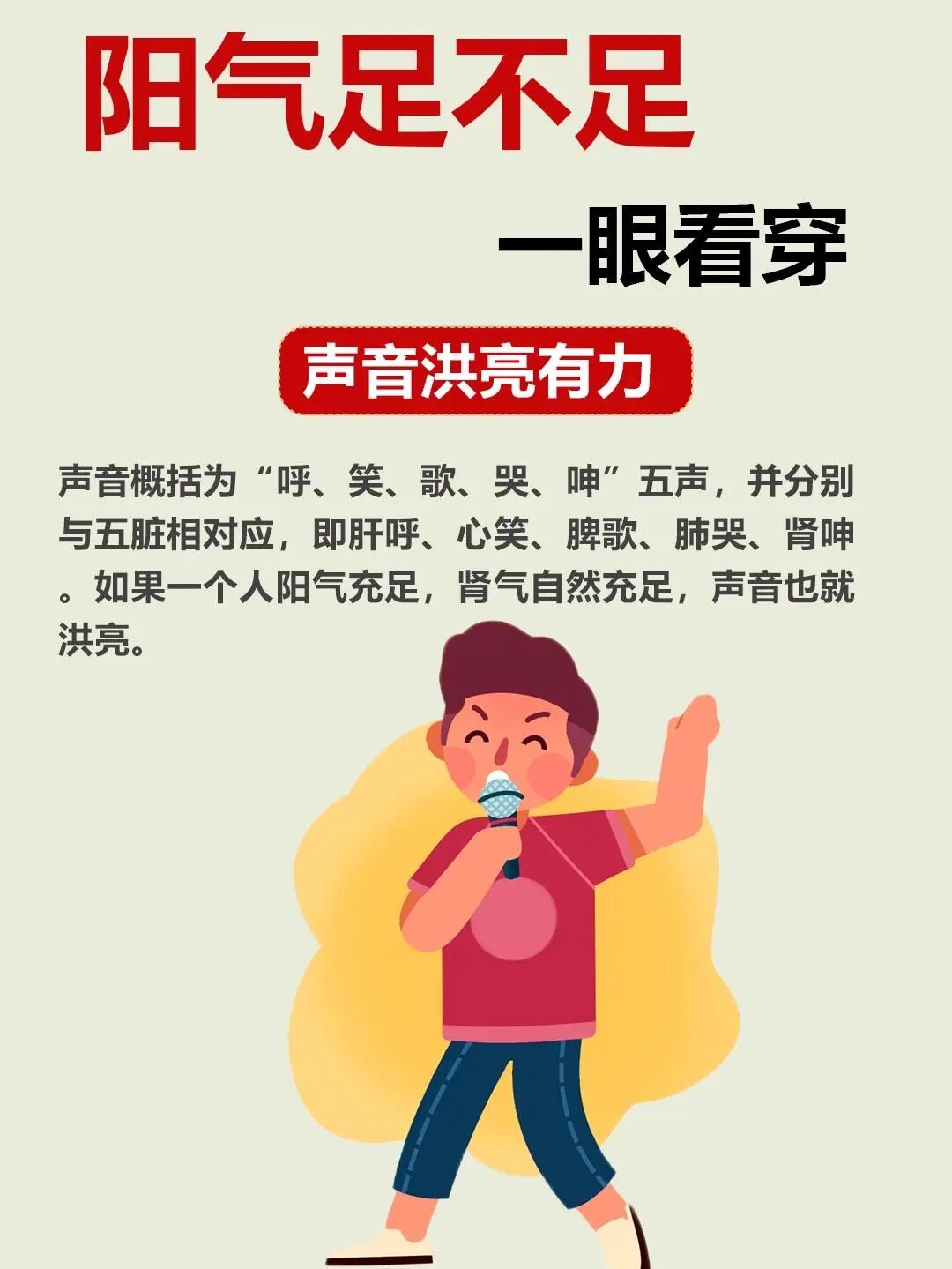 传统中医认为,声音与五脏相对应,阳气充足的人通常肾气充盈,声音自然洪亮、有力。如果你听到自己或身边的男人声音洪亮,清晰有力,往往表明阳气充足。而如果声音低沉、虚弱,可能与阳气不足有关。