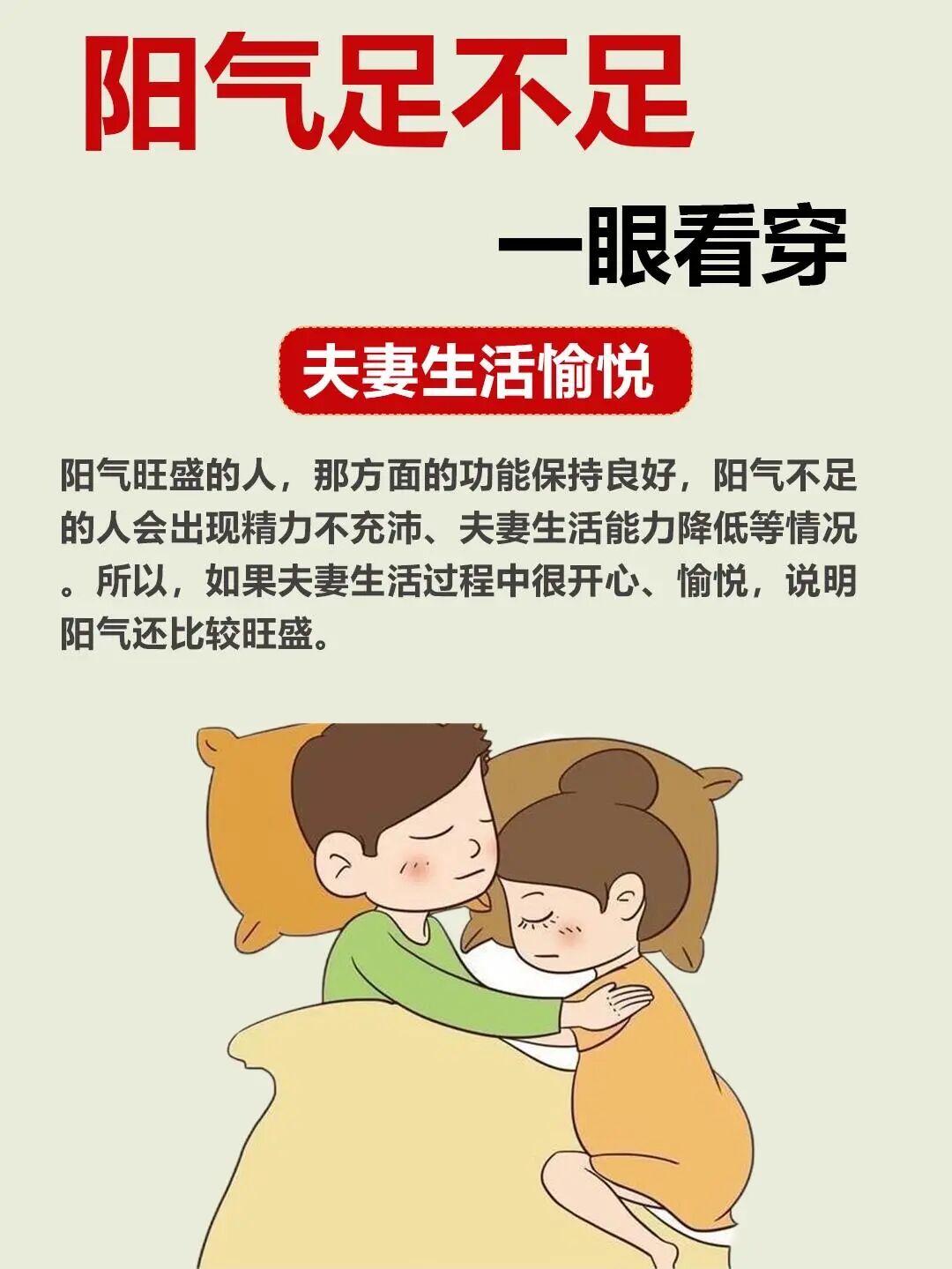 性生活的质量与阳气密切相关。阳气旺盛的人在性生活方面通常表现良好,精力充沛,能够维持较高的活力和愉悦感。如果你在性生活过程中感到开心和满足,并且精神充沛,那么可以说明阳气是充足的。相反,阳气不足可能导致疲倦、缺乏性欲,影响夫妻生活的质量。