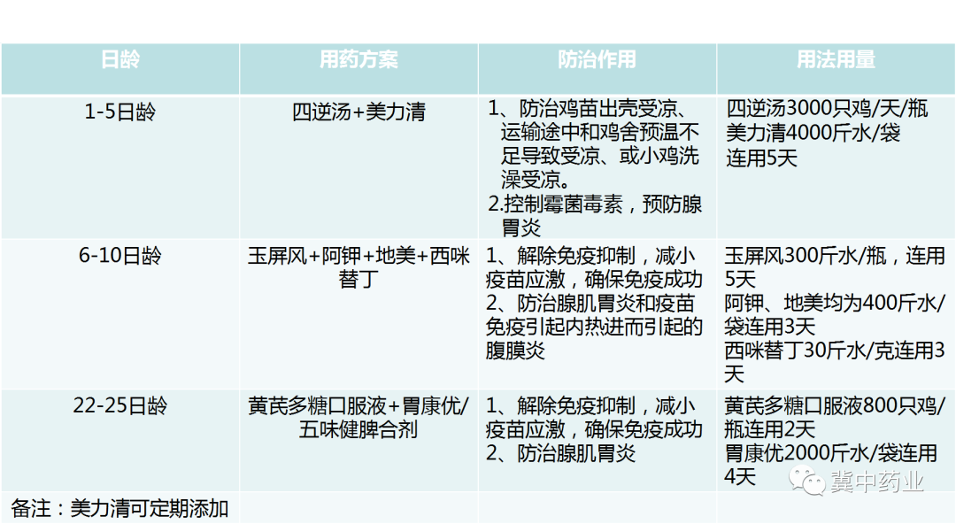 肉鸡为纯阳动物,而抗生素和清热解毒的药均为大寒之品,自身阳气不足所以先补阳气,再对症对因用药具体治疗方案如下:
