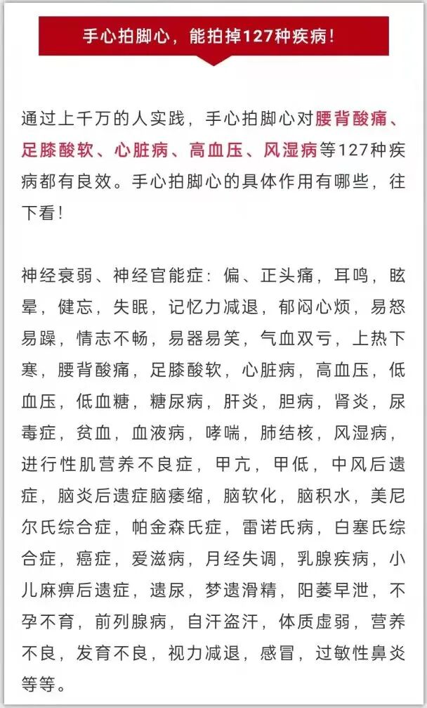 通过上千万的联系,手心拍脚心对腰背酸痛、足膝酸软、心脏病、高血压、风湿病等127种疾病都有良效。手心拍脚心的具体作用有哪些,往下看!