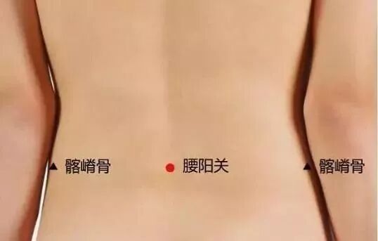 腰阳关在髂骨的位置,髂骨就是平时系腰带下方突出的骨头,双手大拇指在髂骨边缘固定,双手食指在背后交汇,与两个食指连线平行的、位于脊柱上的那个点,就是腰阳关。
