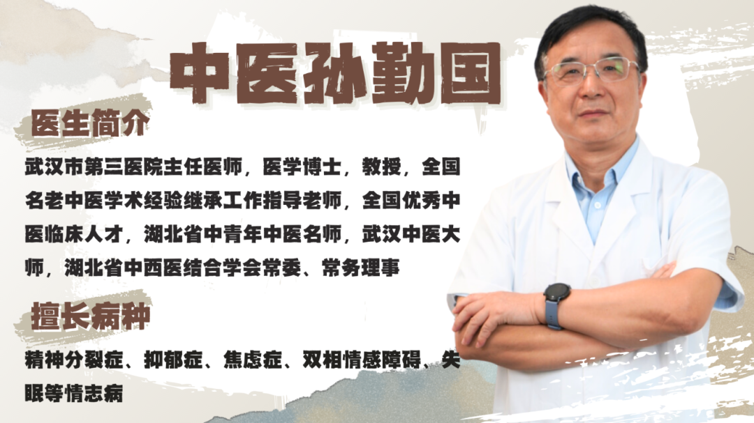 我是中医孙勤国,武汉市第三医院主任医师、医学博士、教授,从事中医临床、教学研究40多年,擅长治疗精神分裂症、抑郁症、焦虑症、双相情感障碍、失眠等情志病。