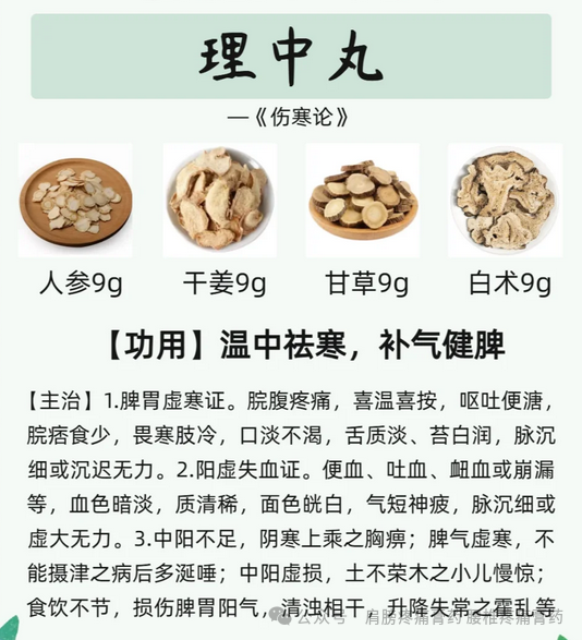 理中丸:出自《伤寒论》,由人参、干姜、炙甘草、白术组成。方中干姜大辛大热,温脾阳、祛寒邪,为君药;人参甘温,补气健脾,助干姜以振奋脾阳,为臣药;白术健脾燥湿,为佐药;炙甘草益气和中,调和诸药,为使药。
