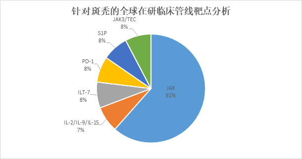 细分所有临床在研疗法的靶点,JAK抑制剂以61%的比重占据绝对优势,而其他疗法针对的靶点基本都是以个体出现。疗法类型方面,传统的小分子抑制剂(10款)处于主导地位,2款疗法为单克隆抗体,分别靶向PD-1和ILT-7,还有一款疗法为多肽。
