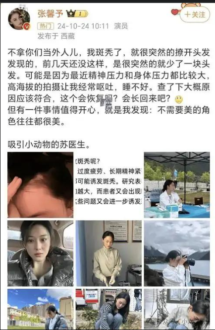 张馨予在社交媒体上晒出照片,照片中可以明显看到她的头发秃了一块,令人心疼。她还透露在拍摄期间呕吐、睡不好,身体和心理都承受着巨大的压力。