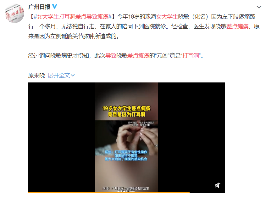 让人没想到的是,罪魁祸首竟是打耳洞。原来,此前小敏打完耳洞后一直流水流脓,不过她却没在意。谁知拖了几个月后,竟导致自己差点瘫痪!