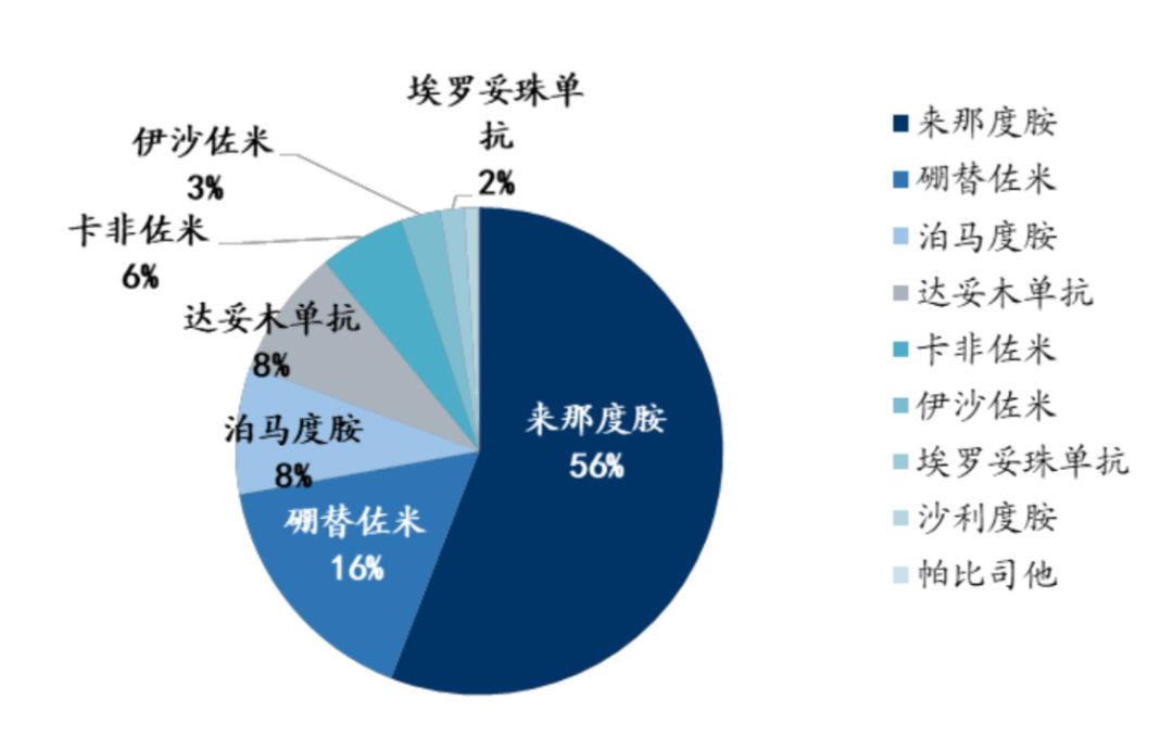 目前多发性骨髓瘤的主要治疗药品有免疫抑制剂、蛋白酶抑制剂和单克隆抗体三大类。其中,来那度胺占据约55%市场份额,硼替佐米约占15%-20%的市场份额,其余份额由泊马度胺、达雷木单抗、卡非佐米、伊沙佐米、埃罗妥珠单抗、沙利度胺和帕比司他占据。