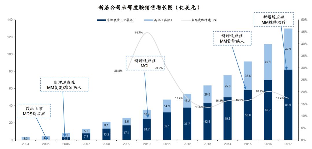 2017年,新基多发性骨髓瘤治疗领域实现收入99.33亿美元,收入占比76.57%。其中MM一线重磅单品瑞复美(来那度胺)实现收入81.87亿美元,收入占比63.1%。