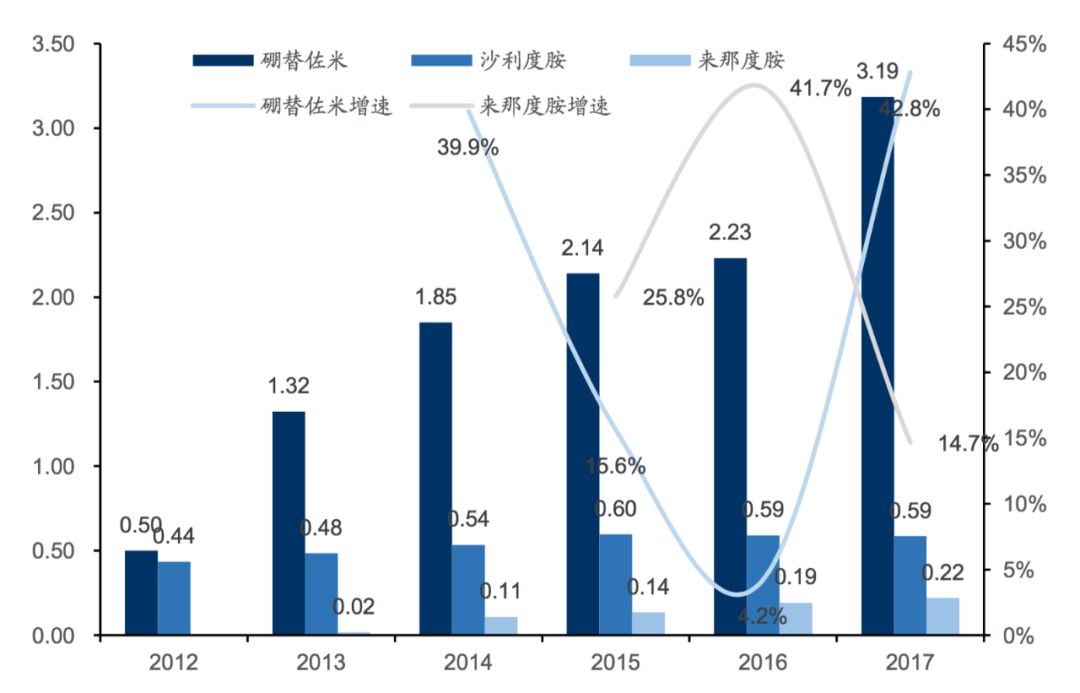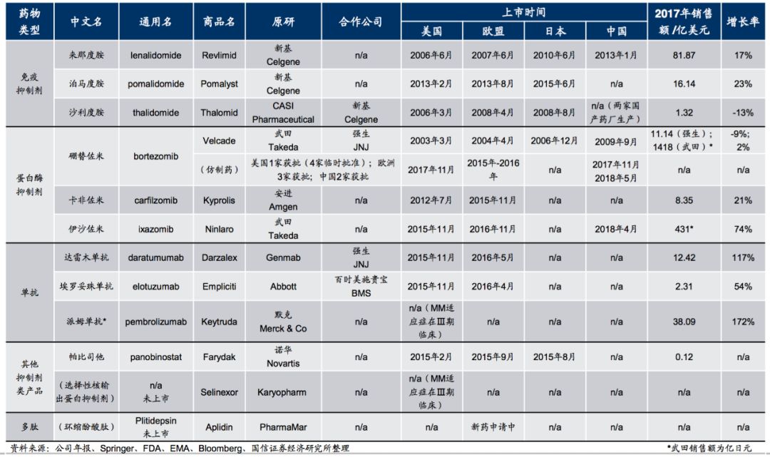 新的大分子类药物达雷木单抗和埃罗妥珠单抗上市后(2015年)迅速成长为年销售额过亿美元的大品种。其中,强生公司的达雷木单抗(anti-CD38)受益于适应症不断拓展(四线用药→一线用药) 以及强大的市场推广和销售能力,增长十分强劲,2017年销售收入12.42亿美元,增速高达117%。