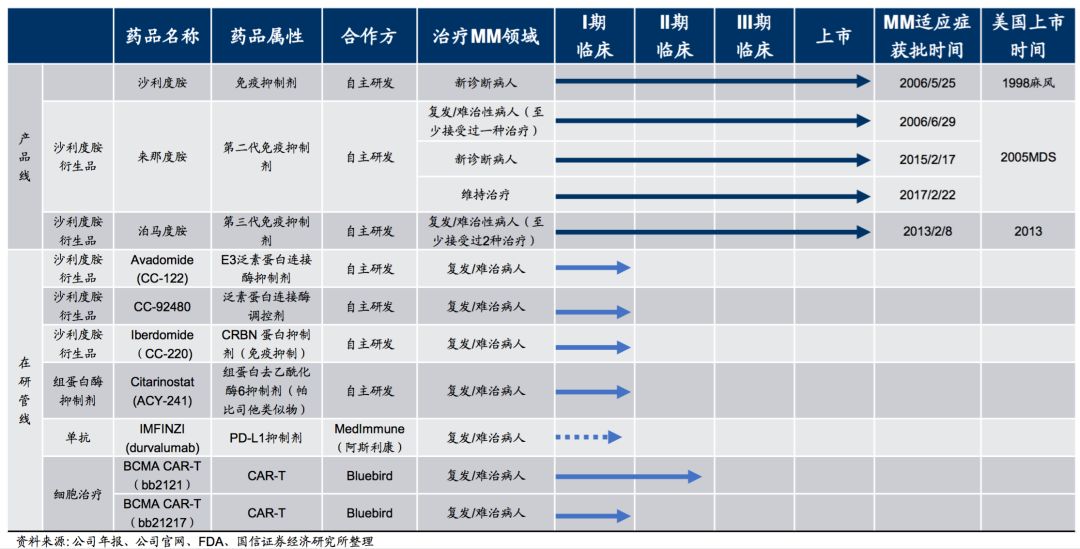 新基公司靠反应停(沙利度胺)老药新用治疗多发性骨髓瘤起家,自该产品上市后,公司深耕多发性骨髓瘤治疗市场,以沙利度胺为起点,通过自主研发、合作开发等多种形式,逐步形成了沙利度胺衍生物、组蛋白酶抑制剂、PD-L1单抗、BCMA CAR-T细胞治疗等多类型的产品梯队。