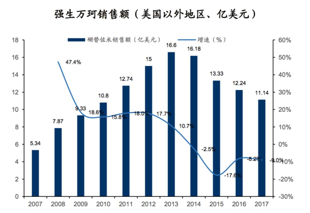 受到同类蛋白酶抑制剂类药物和其他竞品的竞争,以及仿制药上市的消极影响, 万珂在中国以外地区的销售自2015年之后均出现了不同程度的下滑。