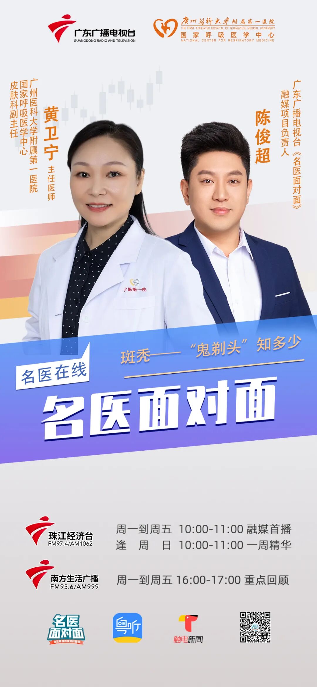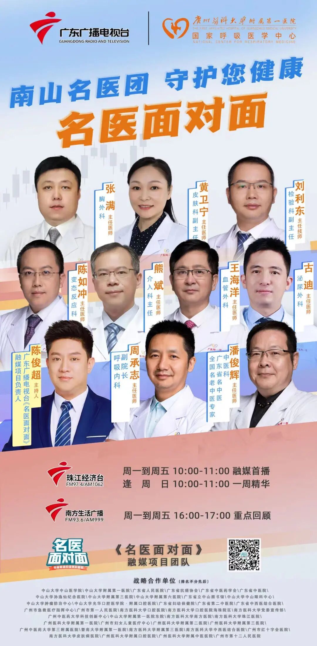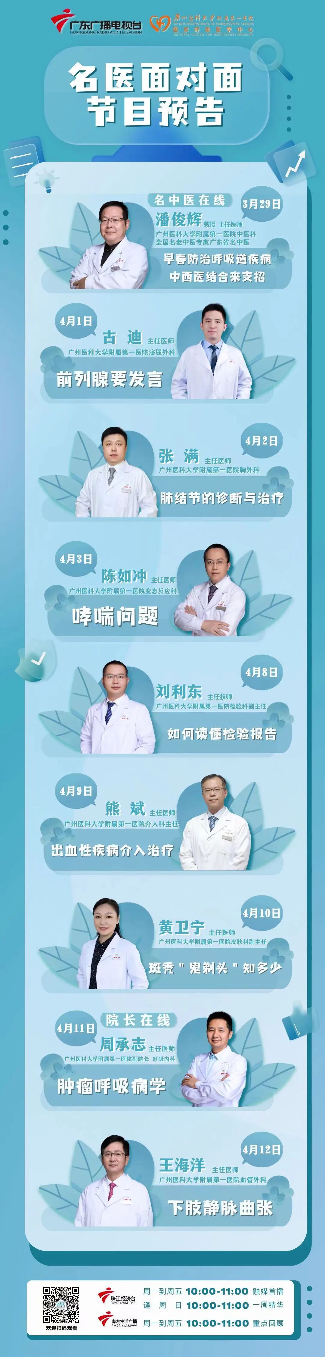 3月29日开始,《名医面对面》节目将会邀请广州医科大学附属第一医院一众大咖院长、主任、专家来到节目与观众、听众互动,欢迎大家踊跃参与。