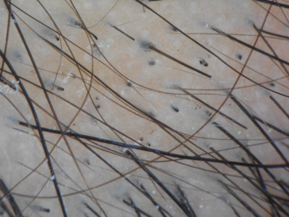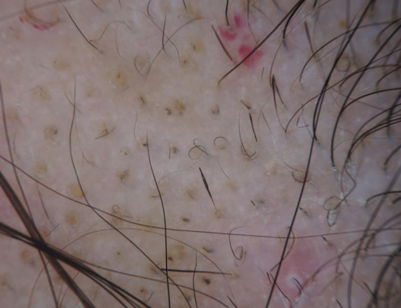 AA的脱发区域毛囊开口完好存在,脱发区域可见感叹号样发、黑点征、黄点征、断发、锥形发(毛发近端逐渐变细)、毛干粗细不均、毳毛增多以及猪尾状发等。(如下图所示)