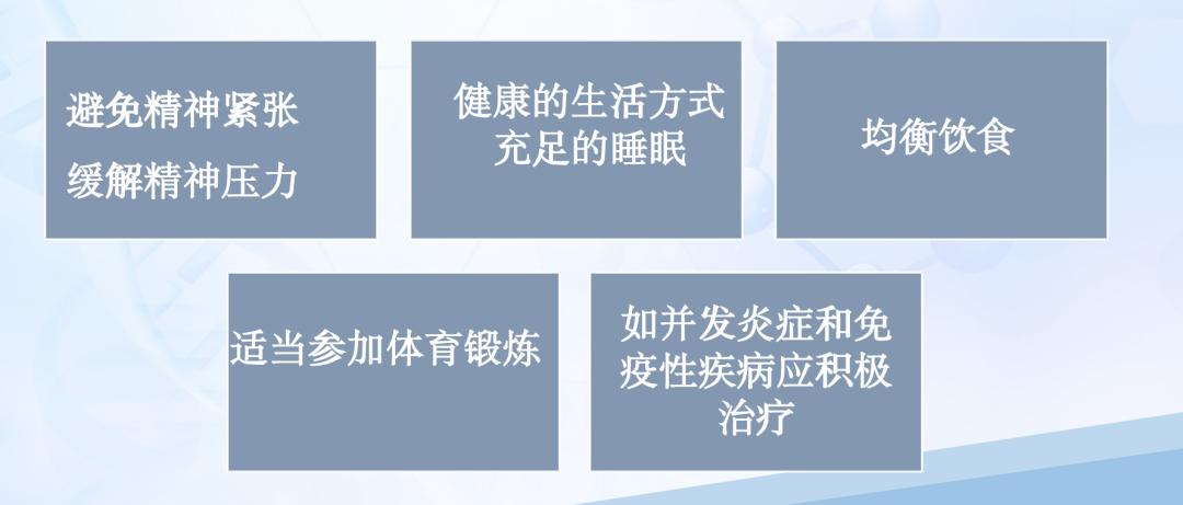 一是规律作息。毛囊对身体内部的变化非常敏感,所以睡眠模式改变有可能诱发斑秃。因此,不建议加班熬夜。患者应尽量做到规律作息,保证每天充足、高质量睡眠,防止和减少斑秃的发生。二是保持乐观心态。斑秃容易使患者产生负面情绪和心理负担。焦虑、抑郁可使斑秃病情加重或反复,从而形成恶性循环。建议通过冥想、听音乐 、看电影等方式,缓解精神压力。