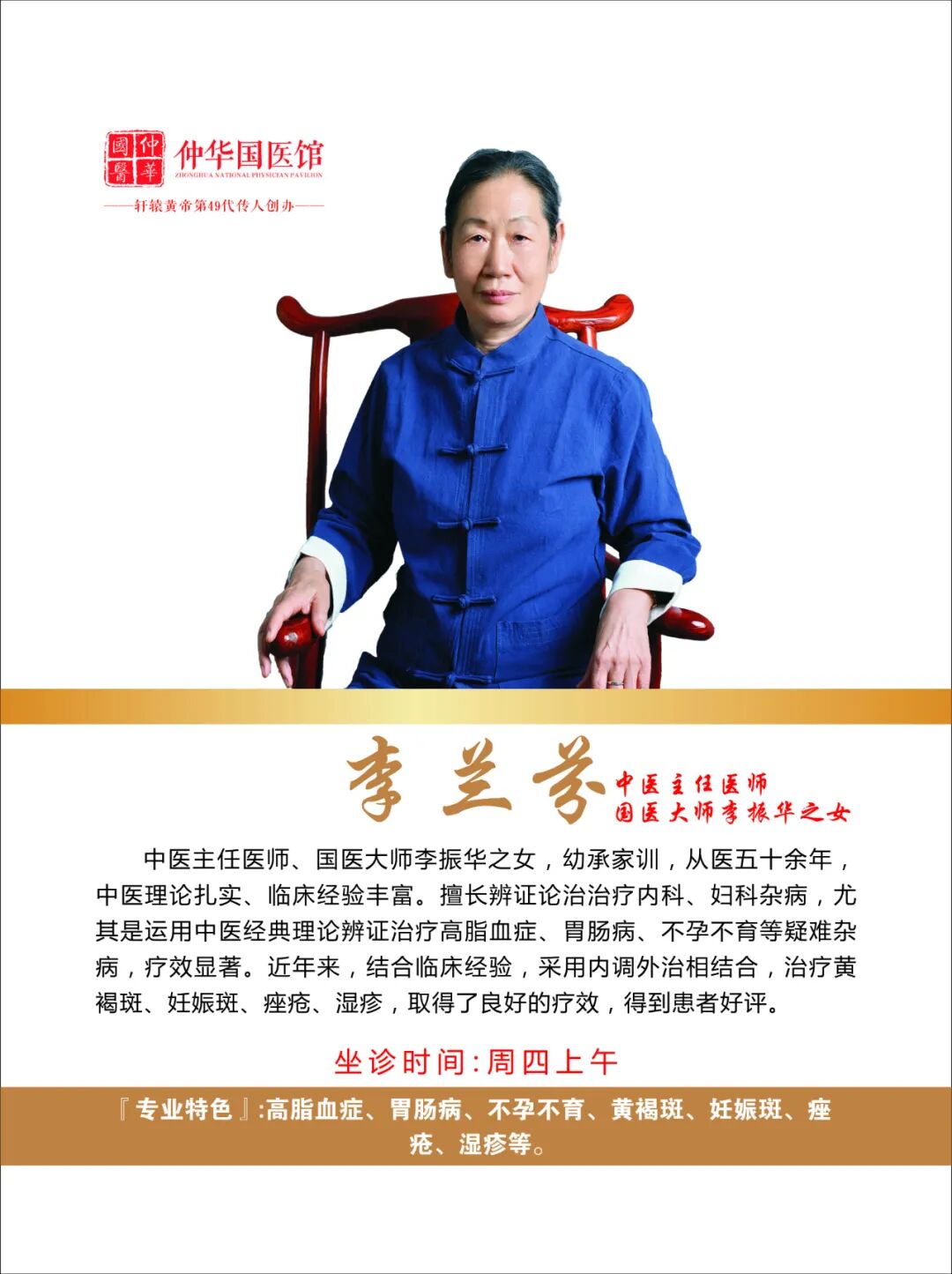 中医主任医师、国医大师李振华之女,幼承家训,从医五十余年,中医理论扎实、临床经验丰富。