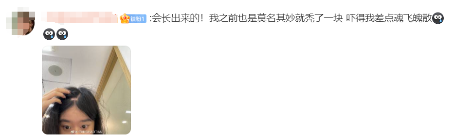 不拿你们当外人儿,我斑秃了,就很突然地撩开头发发现的,前几天还没这样,是很突然的就少了一块头发。
