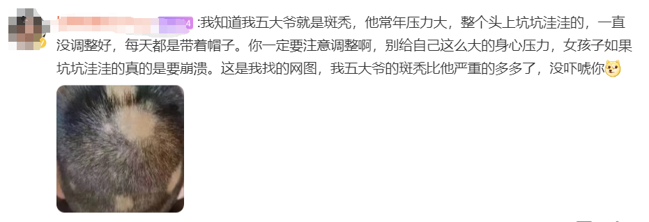 发博称自己斑秃了: