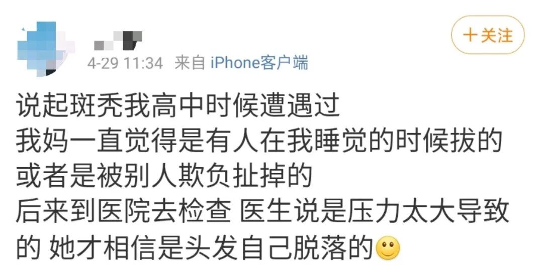 斑秃听起来很遥远,其实中招的人真不老少,甚至有高中就斑秃,妈妈还以为头发是被别人拔掉的……