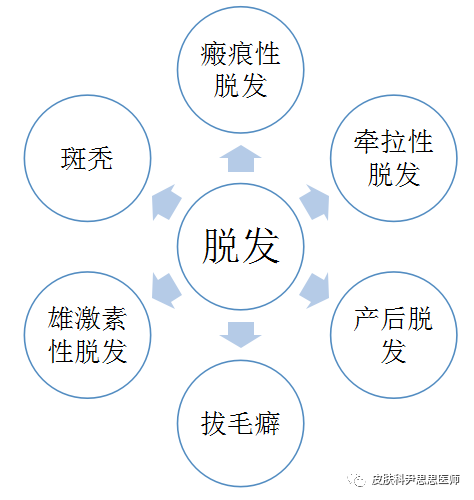(1)物理、化学性损伤:物理、化学性损伤可损害头皮,累及毛囊,从而形成瘢痕性脱发。