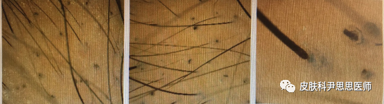 皮肤镜下可见断裂的短发、黑头粉刺样黑点、空的毛囊口、新生的短发。