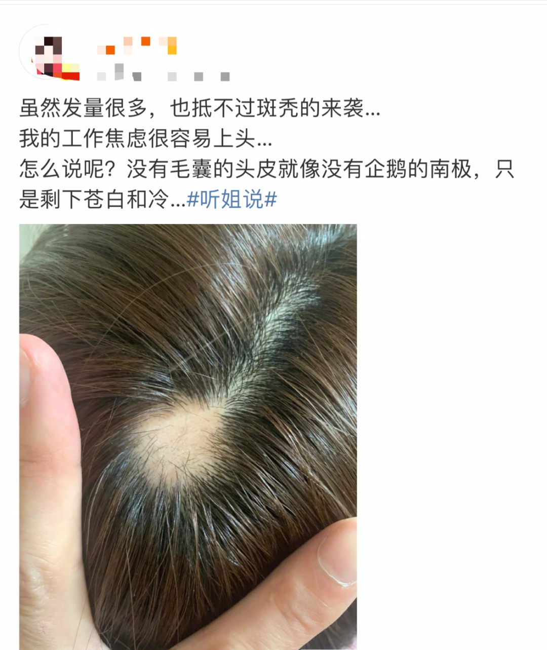 近日,湖南台著名主持人发微博称,由于自己的工作焦虑很容易上头,虽然发量很多,但也抵不过斑秃的来袭。并发布了一张自己头顶上斑秃的照片,脑袋顶部露出一大块头皮,画面惊人,引发大量粉丝和网友的心疼,纷纷留言要她好好保重自己的身体。