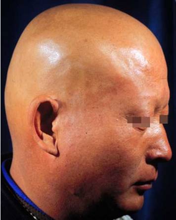 斑秃持续加重逐渐会引起全秃、普秃;所谓全秃 是整个头顶无头发再生长,所谓普秃 是全是毛发都会逐渐脱落 如图: