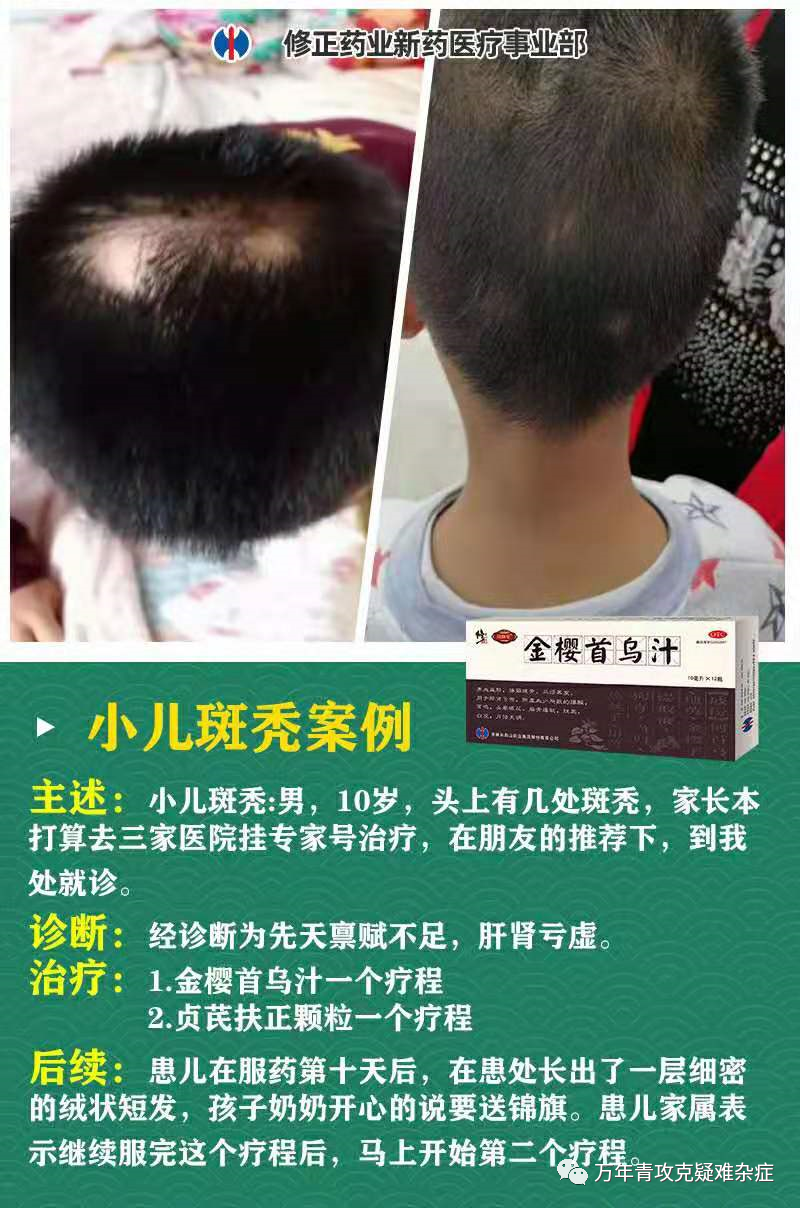 当前治疗斑秃的方法很多,可以说五花八门,现在我们说一说斑秃的治疗,推荐修正金樱首乌汁。