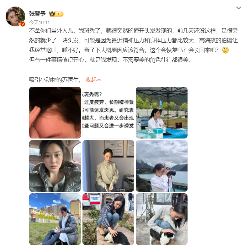 10月24日,演员张馨予发博称自己斑秃了:不拿你们当外人儿,我斑秃了,就很突然的撩开头发发现的,前几天还没这样,是很突然的就少了一块头发。有网友在评论区晒出同款。是什么原因导致斑秃呢?
