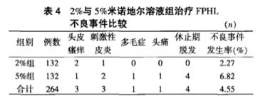 30例外用米诺地尔涂抹观察组患者中有2例分别于治疗后的第4天和第12天,局部用药处出现红肿、痒,反应较轻微,继续用药红肿消退恢复正常