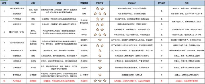列举了一下目前我所见过的所有脱发类型和解决办法,比较懒的可以直接看表里的内容总结,想扩充知识面的不妨静下心来看看,绝对会有收获。