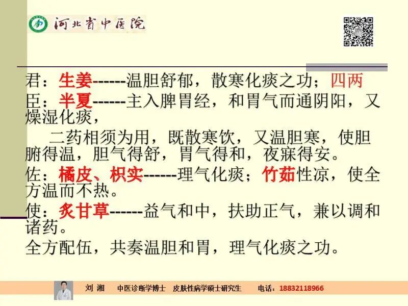 君臣佐使的分类,君药是生姜,生姜有温胆舒郁、散寒化痰之功,臣药半夏主入脾胃经,和胃气而通阴阳,燥湿化痰,二药相须为用,散寒饮又温胆寒,使胆腑得温,胆气得舒,胃气得和,夜寐得安。佐药是橘皮和枳实,理气化痰;竹茹性凉,使全方温而不热。使药是炙甘草。临床我用的炙甘草比较多,主要有益气和中,扶助正气的调和诸药的作用。全方配伍,共奏温胆和胃,理气化痰之功。这是温胆汤的一个方解。那么临床对于温胆汤的治疗的相关文献,在《小儿直证要诀》这卷书,一方是温胆汤里面提到的温胆汤主治的小儿的惊、惧、顽痰。也就是说,这对小孩子受惊以后,用这个药剂比较多。但是这个方剂用的时候,里面提到加上酸枣仁有镇静安神的作用,共同来治疗。第二,在《医方类聚》的第二十三卷,经验秘方中提到的温胆汤,有定心志的作用,这里加了远志和酸枣仁,就是定心志的作用。另外,在《明医杂著卷·六方之温胆汤》,提到的温胆汤的主治胆气怯弱、惊悸少寐、发热呕痰、饮食少思,这里加了生姜和大枣,就温胆汤的基础上加了这几味药,其实根据咱们刚才对于温胆汤的治疗方向的一个总结,温胆汤的主要治什么?和神志有关系的,像刚才提到的三个方的惊惧、神志不宁等等症状,就提示了惊惧少寐等等与神志有关的病变,认为是各脏腑最为常见的表现之一。所以对于小儿的脱发,小儿的脱发问诊的时候,比如说小儿为什么脱发?小孩住校,比如说是留守儿童,都可能出现这种情况。所以,在刚才总结的同时用药上提示温胆汤治疗神的病变的时候,佐用寒凉竹茹,可使情去之,可增加养心宁神和健脾的药物来进行综合治疗。其实在临床的时候,像这类如果有精神情志关系脱发的时候,一般情况温胆汤就派上用场,就可以大胆地使用,往往会取得非常好的效果。但是临床的时候我用的比较多的,因为和神志有关系的,所推荐的龙牡温胆汤用的比较多,多治疗胆气怯弱、心神不宁所致的惊悸,夜寐不安加龙骨,牡蛎,可以宁神定志,同时加大茯苓的剂量以加强其安神的功效,严重的时候加夜交藤,加合欢花、合欢皮等等之类的药来进行综合的治疗。其实镇静安神的这方面临床用的龙骨、牡蛎,这个咱们用的比较多,那如果加上温胆汤的话,对镇静安神的效果就更加强了。另外还可以用上桃红温胆汤就加桃仁、红花。另外严重的可以加上养血的当归和川芎来进行综合的治疗。