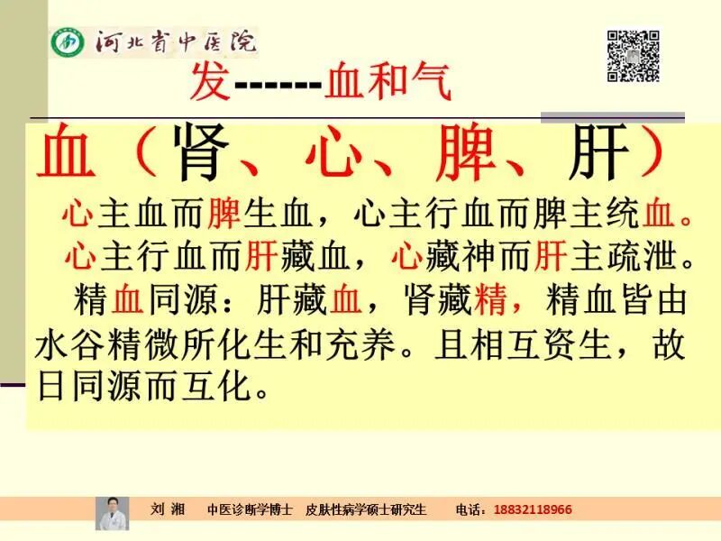 咱们说头发和血、气的关系,我给大家总结了一下,血和什么有关系呢?血和肾脏、心、脾、肝有关系,心主血而脾生血,心主行血而脾主统血。