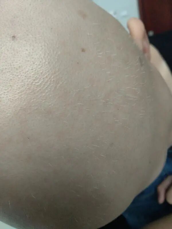 下面,我把最近的一个病例跟大家分享一下,是4月2号的,女性患者,26岁,脱发病史已经3年。是个普秃,头发、眉毛包括腋毛和阴毛全部脱落,各方求医均无效果,后来经过朋友的推荐就过来进行尝试。