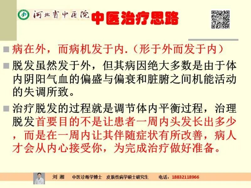 说,发的生长,赖血以养,故称发为血之余。但发的生机根源于肾。肾藏精,精化血,精血旺盛,则毛发粗壮而润泽,所以《素问·六节藏象论》说:肾其华在发。从这一段的评论,咱们可以知道头发和气血有关系,和肾脏也有关系。所以好多患者过来以后就问:大夫我肾虚不肾虚。因为咱们好多的外边的大夫就误诊,给病人的误诊信息就是只要你掉头发就与肾虚有关系,其实咱们知道脱发,除了和肾脏有关系之外,与好多疾病、好多脏器都有关系。那么临床来说,根据咱们刚才的理论,临床中医的治疗思路,我上次跟大家也分享过中医的治疗思路,就是病在外,而病机发于内(形于外而发于内)
