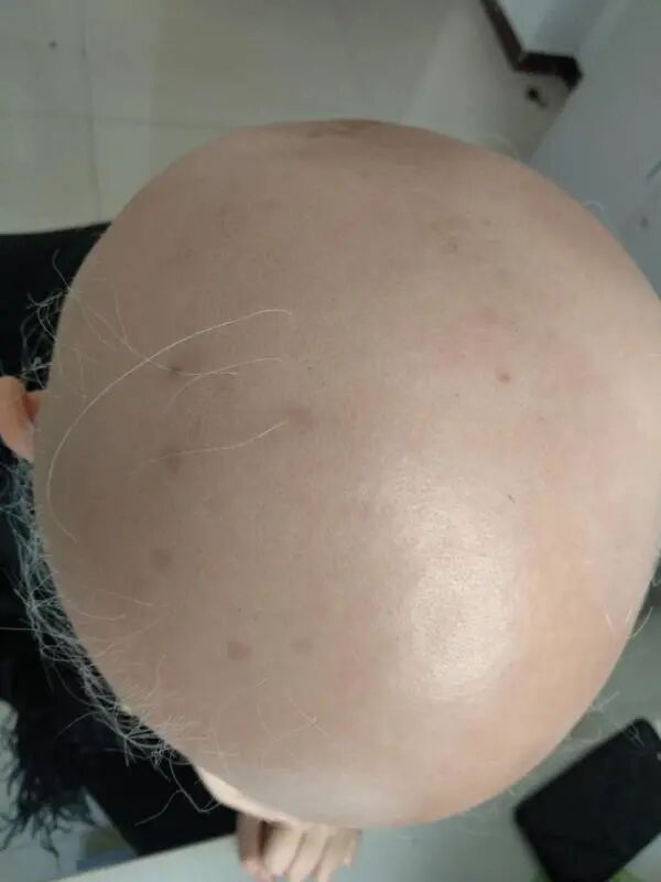 因为这个病人已经在外地治疗了好多地方,所以来了以后,我就让她填了问诊表。进行辨证,仔细询问病史。这个患者在三年前有一个男朋友,两个人准备结婚,已经谈婚论嫁了,这时候这个男朋友发生了劈腿事件,打击甚重,接下来她最爱的奶奶也因病故去,所以两者打击加在一起,对该患者打击甚重,就是在短期内头发脱落,眉毛脱落,大概不超过两个月,整个毛发全部脱落完毕。后来就到各地求医,以后头发稍微长出来,长出来以后过段时间又重新脱落,所以这小孩来的时候戴着假发直接过来的。她的眉毛当时画了,看不出来是个脱发的患者,后来进屋以后把假发摘掉就看到头上得毛发几乎都没有了,做皮肤镜以后看到毛囊完全都是一个萎缩的状态。