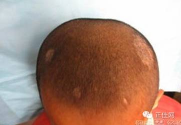 二、假性斑秃头皮有圆形、椭圆形或不规则形的秃头区,患处头皮萎缩、光滑发亮如薄纸。发病原因不明或继发于头皮紫癜风、盘状蝴蝶疮、局限性皮痹等。