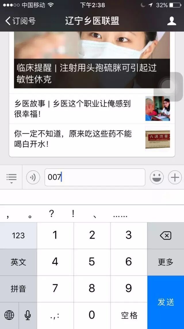 关注辽宁乡医联盟后,如图所示,您可以这样在对话框里输入数字编号,即可查阅相关文章